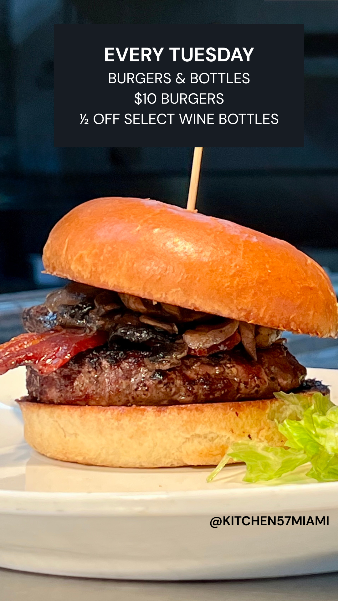Tuesday: Burgers and Bottles, $10 Burgers and Half off Select Bottles of Wine